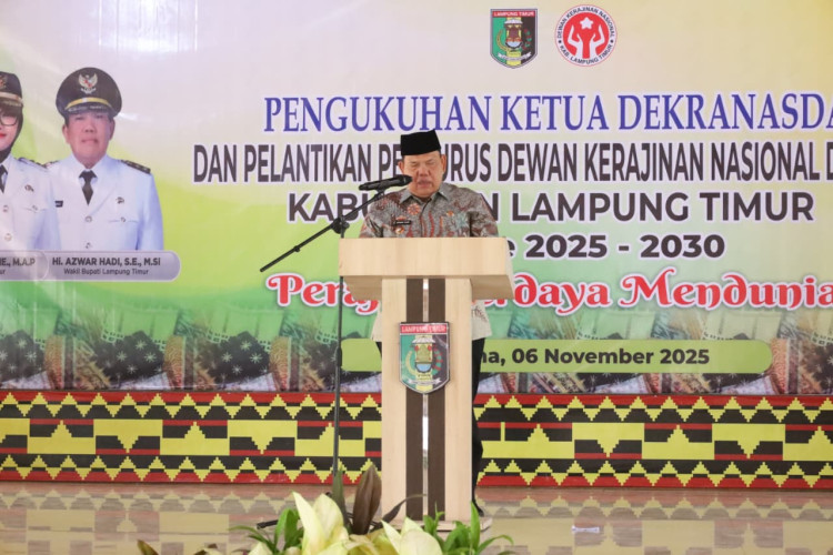 JALANUTAMA.COM, Lampung Timur – Wakil Bupati Lampung Timur, Azwar Hadi, melantik pengurus Dewan Kerajinan Nasional Daerah (Dekranasda) Kabupaten Lampung Timur dalam acara yang digelar di Aula Rumah Dinas Bupati Lampung Timur, Kamis, 6 November 2025.